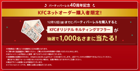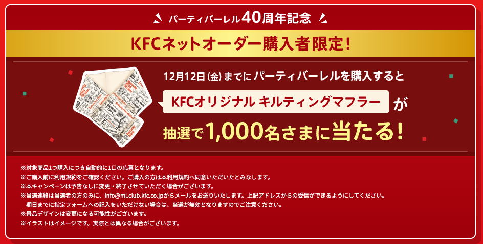 特に、12月12日までの「Xmas早割」を利用すればパーティバーレルが500円お得に、またKFCネットオーダー限定の「オフピーク予約」では「バーガーお試し券」がもらえる特典があります。パーティバーレル40周年記念として、マフラーが当たるキャンペーンも実施中です。