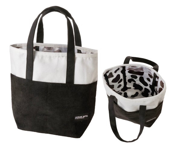 ランチバッグにも利用できる小ぶりなサイズのバッグです。ステーキ宮公式キャラクター「も~たろ~」の牛柄をイメージした裏地がワンポイントとなっており、白黒のデザインはシーンを問わず利用いただけます。 |
