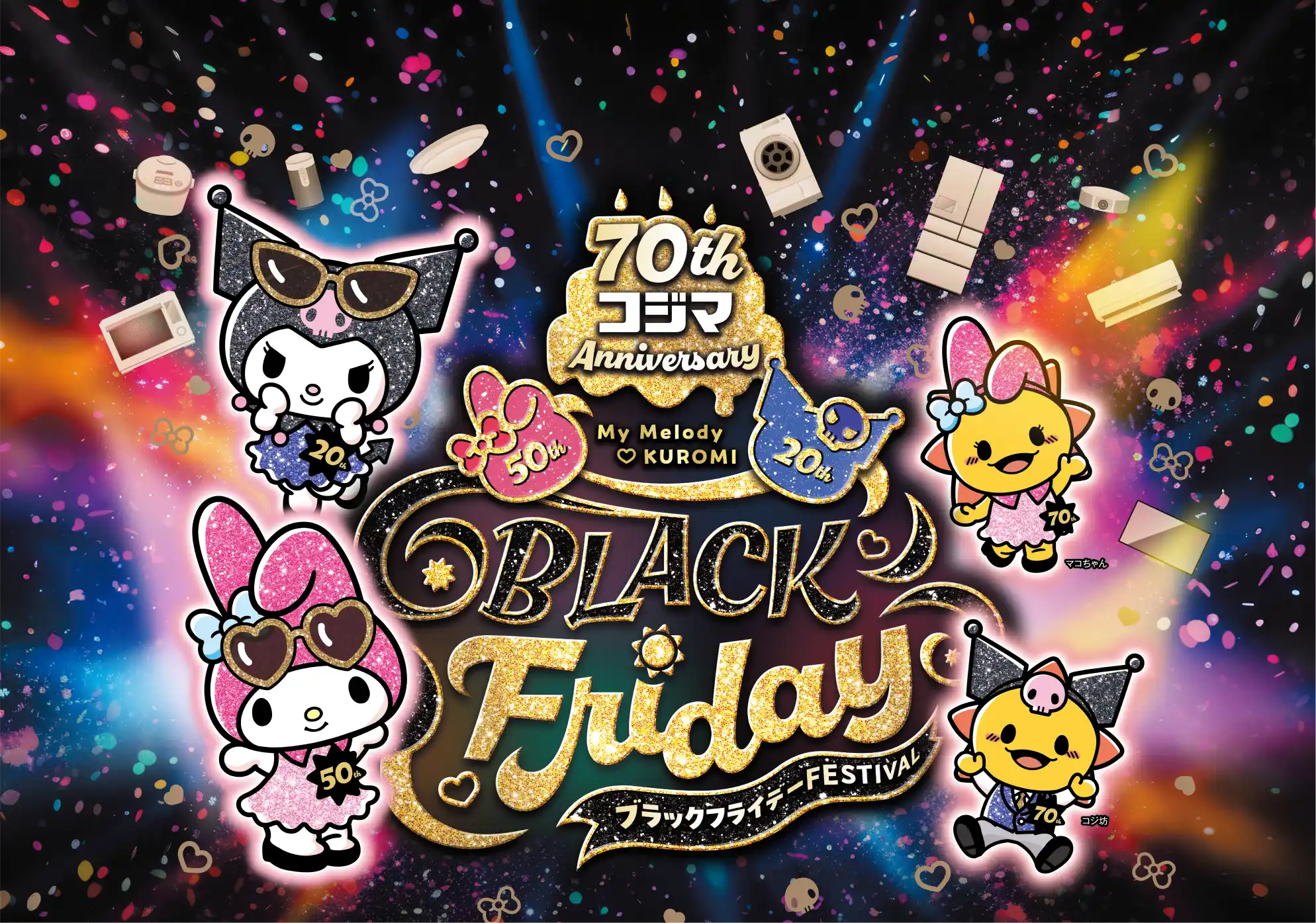 コジマは2025年11月より、70周年を記念した「ブラックフライデーフェスティバル」を開催中。アニバーサリーを迎えたマイメロディ・クロミとのコラボレーションにより、限定グッズのプレゼントや抽選キャンペーン、グリーティングイベントを実施しています。