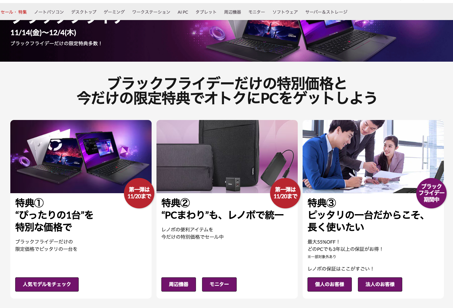 レノボのブラックフライデーセールは、以下の期間と内容で実施されます。