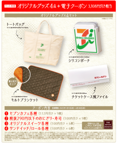 グッズ内容は、セブンイレブン店舗を模した「キッチンタイマー」、セブンカフェのカップをモチーフにした「ラバーコースター」(2種のうちランダムで1種)、京都のSOU・SOUコラボデザインの「ジャガードハンドタオル」(3種のうち1種)、人気クリエイター・パントビスコ氏デザインの干支イラスト入り「ニューイヤープレート2枚セット」(4種のうちランダム2枚)の計4アイテムです。さらにこれらに全国のセブンイレブンで使える電子クーポン(合計3,300円相当)が付いています。