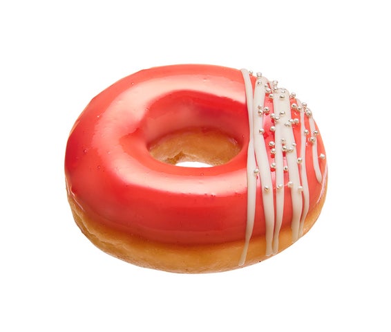 お正月飾りのような鮮やかなドーナツ『ラッキー ストロベリーリング』は、新春らしい赤を基調としたデザインが特徴です。ミルキーなホワイトチョコをベースに、ストロベリーピューレ入りの甘酸っぱいナパージュでコーティング。ホワイトチョコでお正月らしい線を描き、キラキラと輝くアラザンをトッピングし、華やかさを演出しています。