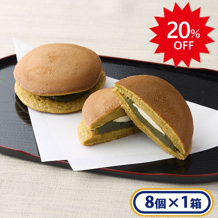 抹茶の風味が豊かな「抹茶バターどらやき 8個入」は、定価2,700円から2,160円でご購入いただけます。