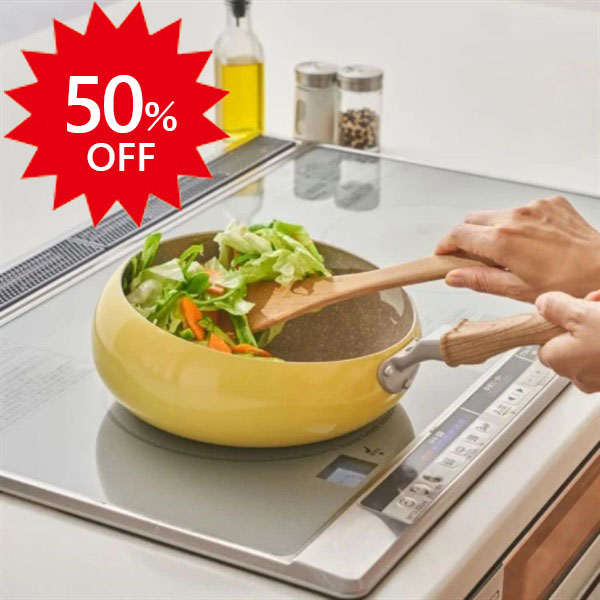 キッチンで活躍する「ポテッと IH対応 フライパン26cmイエロー」は、定価4,290円から2,145円と半額で手に入ります。