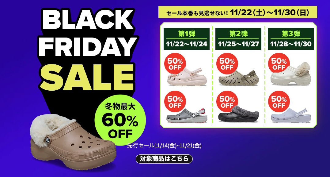 クロックスのブラックフライデーセールは、先行セール期間と本番セール期間に分かれて実施されます。冬物アイテムを中心に、幅広い製品が特別価格で提供されるビッグチャンスです。