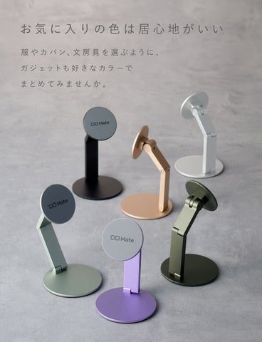 MagSafe対応スマートフォンやマグネット付きケースを吸着させて使用できるスタンドです。デスクはもちろん、リビングや寝室などのインテリアに合わせて使用できるよう、CIO Mateカラーで展開され、新色のカームブルー・エアリーパープルも登場しました。充電機能は搭載していません。