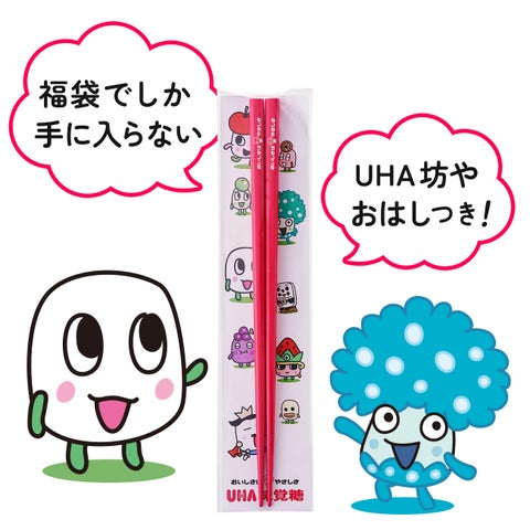 本福袋には、ここでしか手に入らない激レアなオリジナルグッズ「UHA坊やおはし」が特典として付属します。UHA味覚糖のシンボルキャラクターである「UHA坊や」と、企業コンセプトである「おいしさはやさしさ」がプリントされた特別なおはしです。台紙には「ぷっちょむら」の可愛らしいキャラクターたちも描かれており、年末年始に「お菓子なおせち」作りにチャレンジする際などにも活用できるアイテムです。