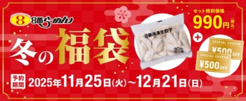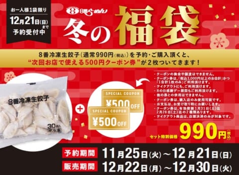 8番らーめん初の「冬の福袋」は、冷凍生餃子とクーポン券がセットになった大変お得な内容です。予約期間は2025年11月25日(火)からとなりますので、この機会にぜひご予約ください。