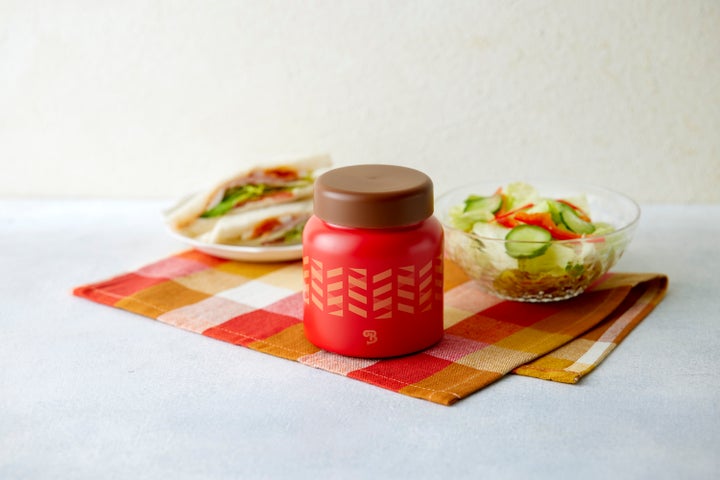 もう一つのオリジナルグッズは「オリジナルスープジャー」です。食卓に彩りを添える赤い本体には、ヘリンボーンをモチーフにした柄がプリントされています。優れた保温・保冷力を持ち、温かい料理も冷たい料理も食べごろの温度で維持することが可能です。