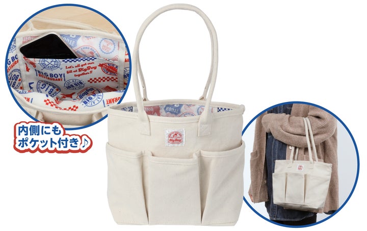 マスコットキャラクター“ボビーくん”のオリジナルロゴがあしらわれたシンプルなトートバッグです。前面に3つのポケット、内側にもポケットを備えており、優れた収納力が特徴です。持ち手は長めに設計されており、肩に掛けて持ち運びが可能です。