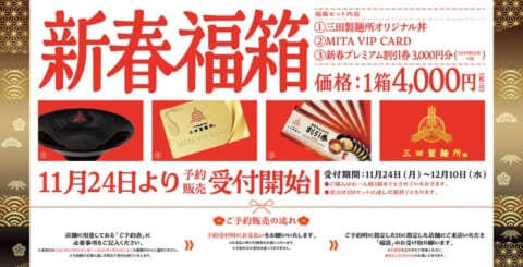 三田製麺所は、初の試みとなる「福箱2026」を数量限定で店頭予約限定発売します。オリジナル丼、VIPカード、3,000円分の割引券がセットになった豪華な内容で、2025年11月24日より予約受付を開始しました。