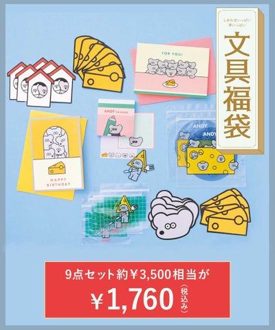 「【福袋】ねずみのANDYがいっぱい! 楽しい文具9点セット」は、おしゃれでかわいい「ねずみのANDY」を堪能できる文具9点がセットになった福袋です。見ているだけで楽しくなるようなアイテムが揃い、ちょっとした贈り物にANDYのカードなどを添えることで、笑顔も一緒に届けられます。ジッパーバッグはプレゼントやおすそ分けにも活用できます。