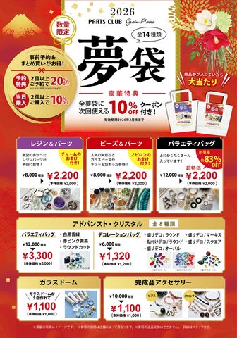 ビーズやアクセサリーパーツを企画・製造・販売するPARTS CLUBは、毎年恒例のお得なHAPPY BAG「お正月夢袋2026」を新年より販売します。全国のPARTS CLUB店舗では、2025年12月1日(月)から夢袋の予約受付を開始しました。