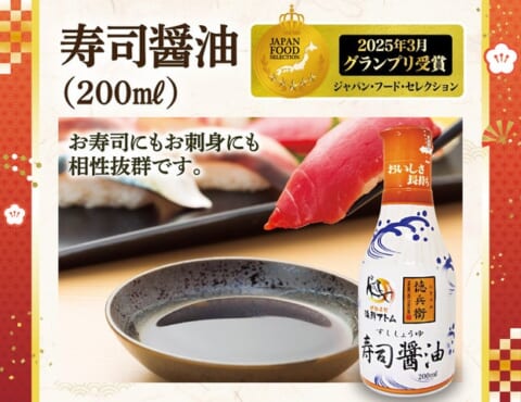 ジャパン・フード・セレクション《スペシャリテ部門》グランプリを受賞した「寿司醤油」です。お寿司にもお刺身にも相性抜群です。