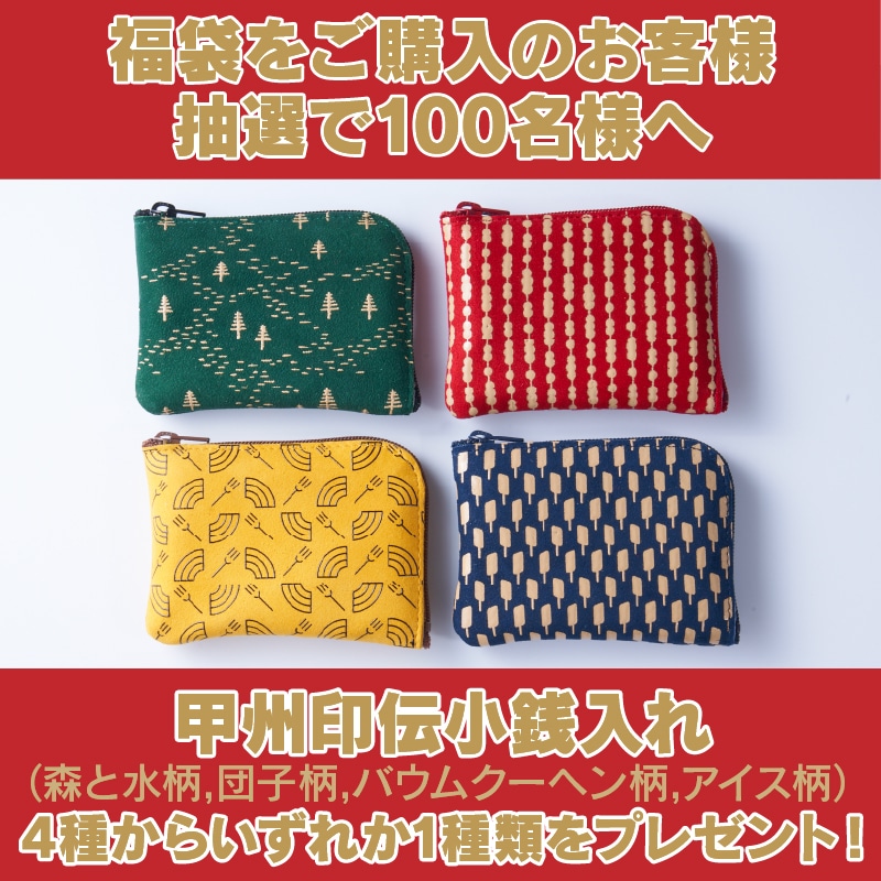 福袋購入者の中から抽選で100名様に「甲州印伝小銭入れ(4種柄いずれか1種)」が当たります。