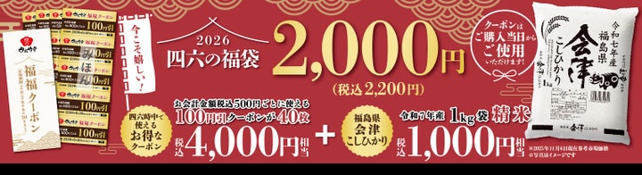 今回の福袋は、『四六時中』でお得にお食事を楽しむことができる「福福クーポン」と、ご自宅で美味しいお米を味わえる「令和7年産会津こしひかり」1kgのセットです。