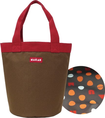 落ち着いた風合いに、なか卯の赤いワッペンがアクセントのトートバッグです。裏地には、なか卯の「こだわり卵」をモチーフにしたたまごデザインをあしらいました。バケツ型で大容量のため、荷物が多い日のお出かけにも適しています。サイズは約タテ28.5×ヨコ34.5×マチ21cmです。