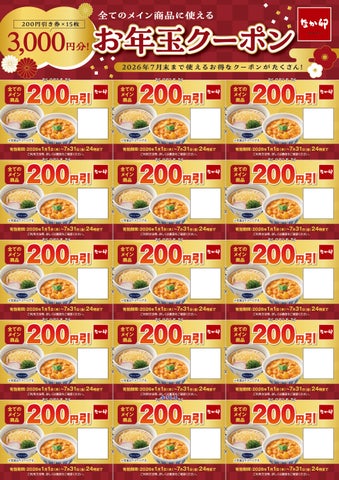全国のなか卯で利用できるお得なクーポンです。200円券が15枚セットになっており、合計3,000円分利用できます。有効期間は2026年1月1日(木・祝)から2026年7月31日(金)までです。メイン商品1品につき1枚利用でき、福袋の購入には利用できません。また、釣銭は出ません。