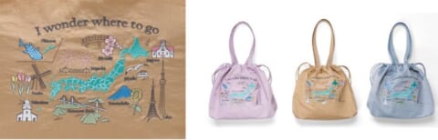 ドローストリングバッグ(ラベンダー、ベージュ、ブルーの3色展開)を含む、総額約11,000円(税込)相当の地図柄アイテム |