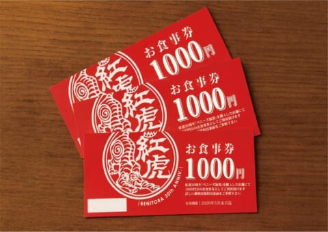 全国の紅虎餃子房(一部店舗を除く)で利用できる1,000円分の食事券が3枚、合計3,000円分含まれます。利用には以下の条件がありますのでご注意ください。
