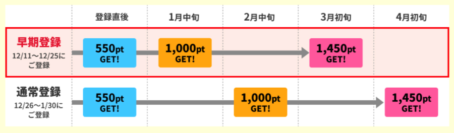 - 12/26〜1/30に登録の場合 … 2月中旬に付与
