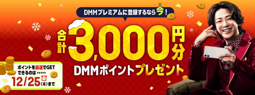 DMMプレミアムに新規登録すると、DMMポイントが合計3,000円分プレゼントされるキャンペーンが2025年12月11日(木)より開催中です。豊富な動画コンテンツやDMMの各種サービスをお得に利用できるこの機会に、開催内容や参加方法を詳しく紹介するのでぜひ参考にしてください。
