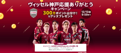 楽天市場では、2025年12月10日(水)10:00から12月13日(土)09:59まで「ヴィッセル神戸応援ありがとうキャンペーン」を開催中です。エントリーと税込3,000円以上のお買い物で、300万ポイントの山分けチャンスや選手直筆サイン入りグッズなどの豪華賞品が当たる抽選会に参加できます。ぜひこの機会を参考にしてください。