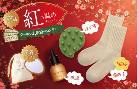 マイナチュレは、冬の冷え込みに寄り添う「外からケアの紅」と「内からケアの白」の2種類の温活福袋を用意しました。それぞれのセット内容をご紹介します。