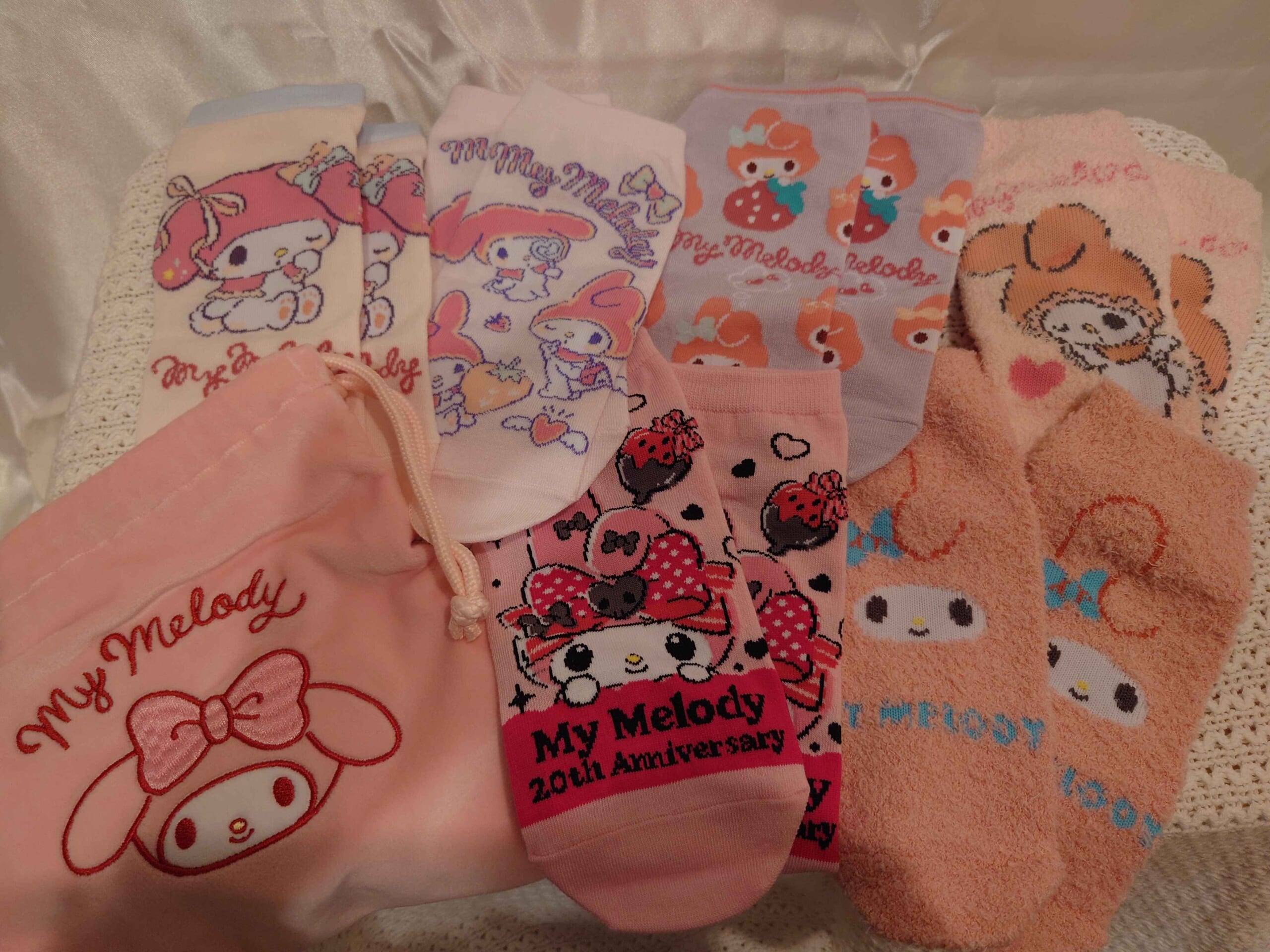 マイメロディデザインの靴下福袋です。クロミと同様にソックス6足と巾着のセットになっています。