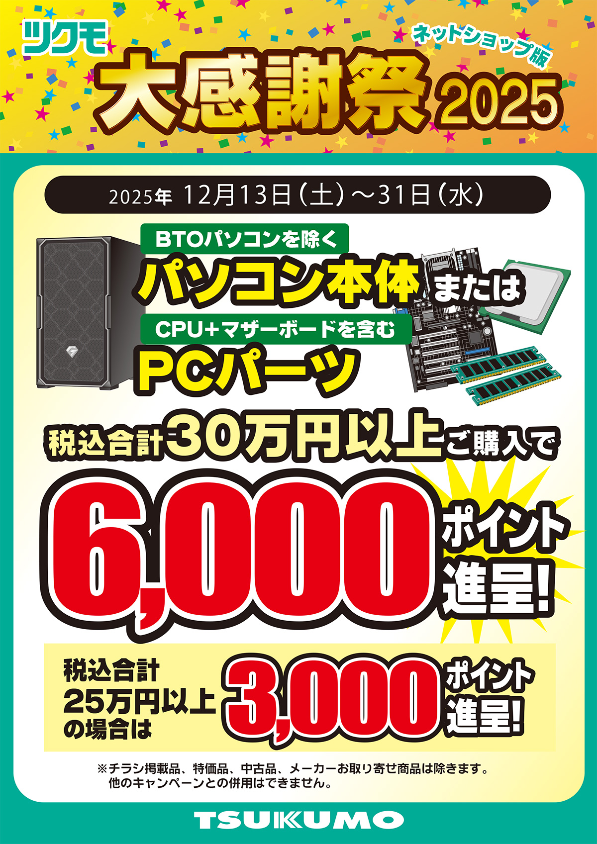 ツクモネットショップ「大感謝祭2025」は、パソコン本体またはCPU+マザーボードを含むPCパーツの購入を対象としたポイントプレゼントキャンペーンです。以下の条件を満たすことでツクモポイントが付与されます。