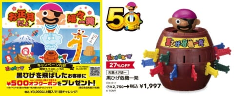 トイザらス初の企画として、ロングセラーパーティーゲーム「黒ひげ危機一発」とのコラボレーションキャンペーンを実施します。税込3,000円以上購入で1回チャレンジし、黒ひげを飛ばすと500円オフクーポン(税込1,000円以上購入で利用可能)をプレゼントします。各店各日先着20名限定です。
