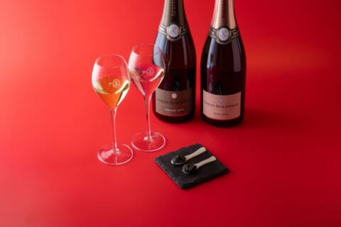 キャビアと紅白シャンパーニュのマリアージュセットは、フランス産フレッシュキャビア2スプーンと、世界最高峰の老舗シャンパーニュメゾン「ルイ・ロデレール」の上級キュヴェ白&ロゼ2杯のペアリングセットです。キャビアの濃厚な旨味に、白は豊かなミネラル感、ロゼは鮮やかな果実味が組み合わさり、それぞれ異なるマリアージュを楽しめます。価格は4,620円(税込)です。
