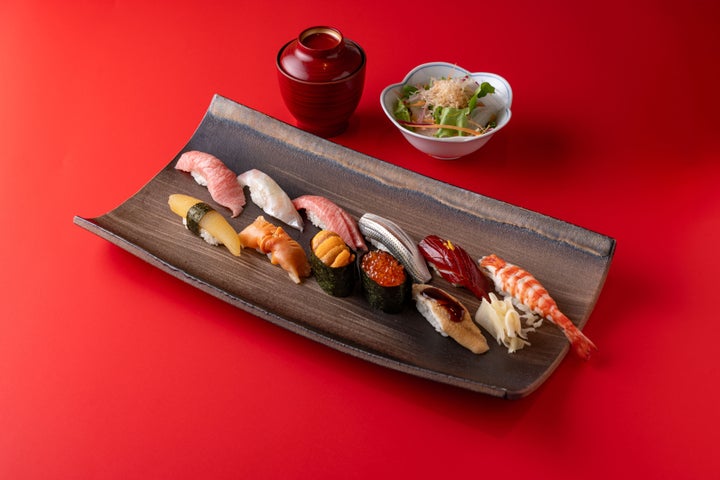 築地特選にぎりは、天然本鮪大トロ、中トロ、漬けマグロを筆頭に、旬の白身、光物、煮穴子、ウニ、イクラに、お正月らしく車海老、数の子を盛り込んだ特選握り盛り合わせです。価格は5,280円(税込)で、有機野菜のサラダとお椀が付きます。