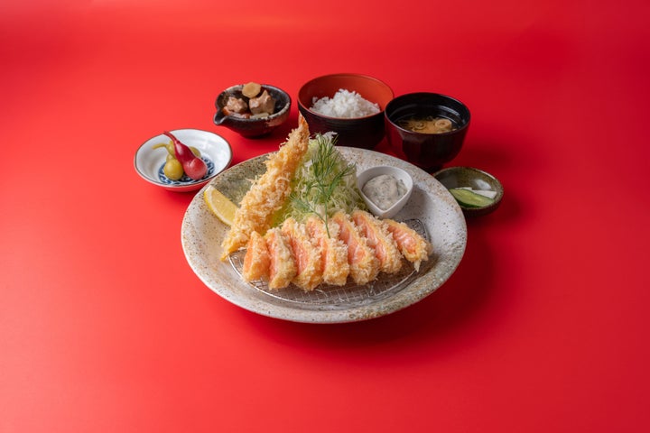 レアサーモンカツと海老フライの寿御膳は、ノルウェー産の刺身用サーモンをレアに揚げたカツと、サクサクの海老フライをメインにした御膳です。タルタルソースに加え、透明醤油と山葵でさっぱりと召し上がれます。ひょうたんの浅漬けや筑前煮といったお正月小鉢を添え、価格は3,850円(税込)で、1日限定10食です。