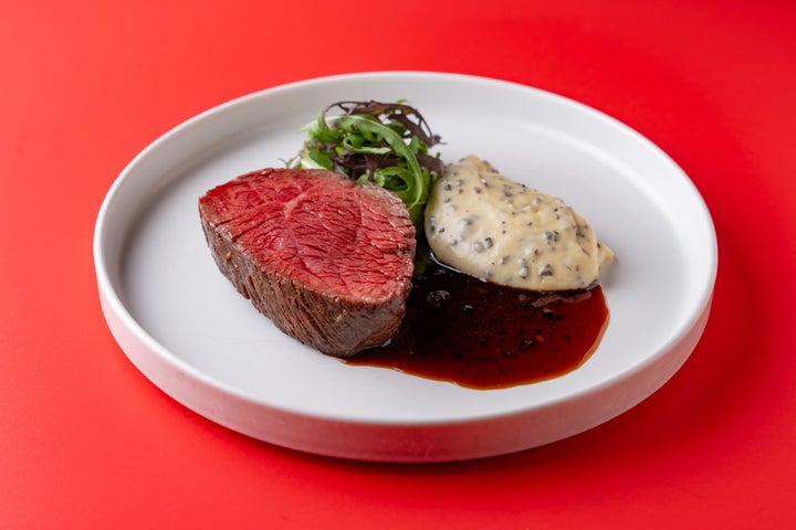 飛騨牛のロースト トリュフソースは、上質な飛騨牛をゆっくりとローストし、贅沢な黒トリュフソースで仕上げた一皿です。価格は8,500円(税込)で、アラカルトとしても、ディナーコースに+1,800円の追加料金で選択できます。