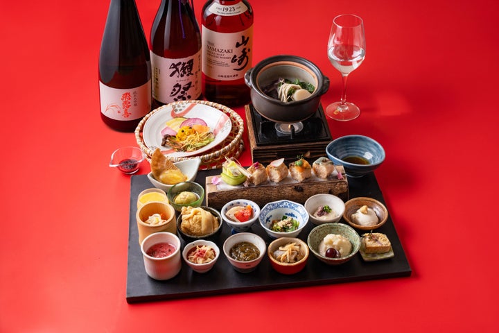 迎春うつくしの御膳は、お野菜寿司五貫、小鍋、旬の小鉢十数種で構成され、美と健康をテーマにした御膳です。獺祭、飛露喜、山崎の中から選べる銘酒一杯が付いて5,900円(税込)で提供します。1日限定10セットです。