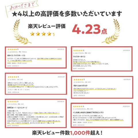 株式会社アップライジングが運営するタチバナE酒販のウイスキーくじは、Amazon、楽天市場、Yahoo!ショッピングなど複数のオンラインストアで展開しており、購入者からは高い信頼を得ています。「開ける瞬間の高揚感がたまらない」「選定に丁寧さを感じる」といった声が多数寄せられています。