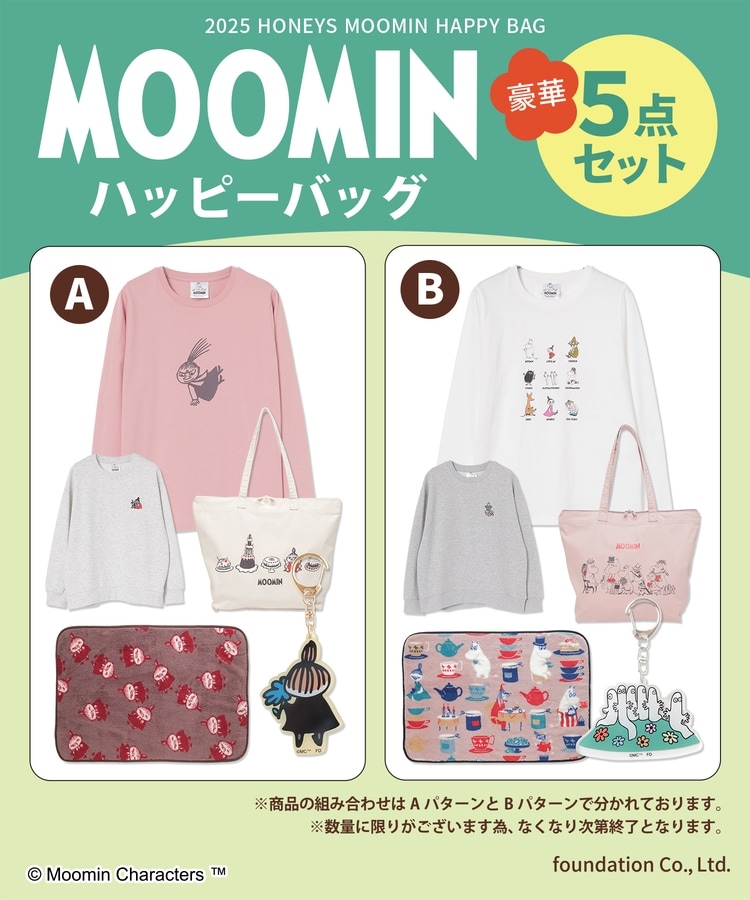ハニーズが提供するムーミン、リラックマ、お文具といっしょのハッピーバッグは、それぞれ個性豊かなアイテムが詰まった限定商品です。キャラクターごとに異なるトップスや、普段使いに便利なグッズが含まれています。