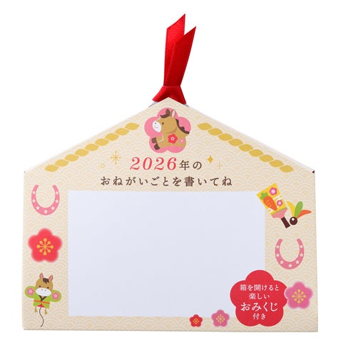 「おみくじ付き絵馬クッキー(10個入)」は、干支の「午」のイラストが入った絵馬型ボックスに入っています。お正月にちなんだ「鏡餅」と「午」をデザインしたクッキーをアソート。ボックス内側のツメ部分には、思わず笑顔がこぼれるおみくじが付いています。裏面にはお願いごとを書き込めるスペースも設けています。