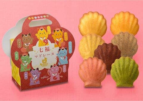 「七福マドレーヌバッグ(7個入)」は、たくさんの福が訪れるよう願いを込めた新春限定のマドレーヌアソートです。「七福神に扮した招き猫」をデザインしたパッケージに、7種の風味豊かなマドレーヌを詰め合わせました。お年賀やちょっとした手土産におすすめです。