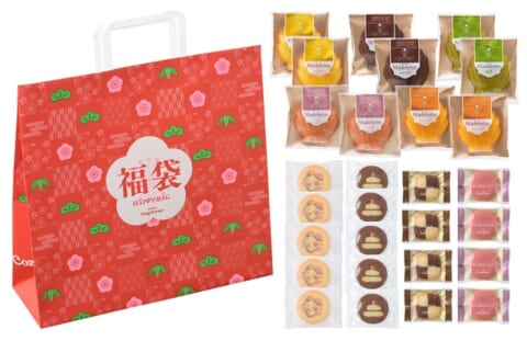 「新春福袋(28個入、グッズ付き)」は、銀座コージーコーナーの定番スイーツをデザインしたオリジナルブランケットが付いたお得な年末年始限定福袋です。干支の「午」とお正月にちなんだ「鏡餅」をデザインしたクッキーや、人気のマドレーヌ5種を詰め合わせました。ご家庭でのおやつや自分用、手土産にも利用できます。