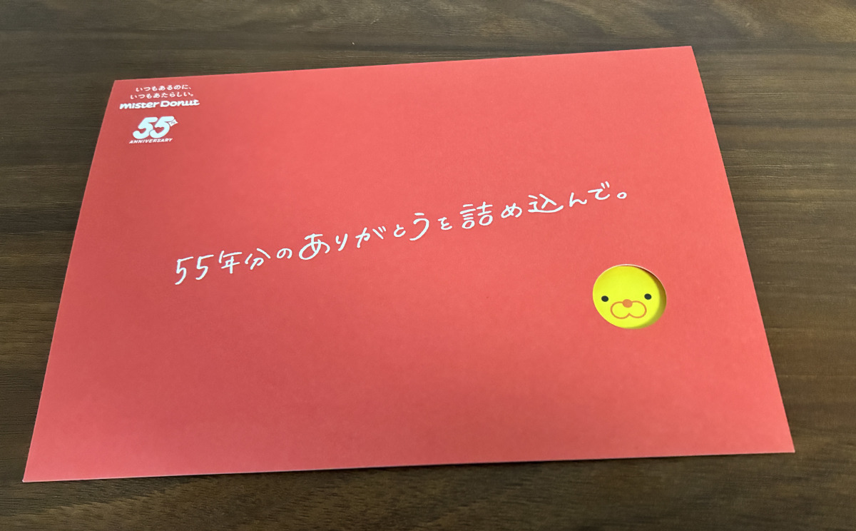真っ赤な台紙に「感謝状」として、ミスタードーナツの55周年を記念するメッセージが記されています。