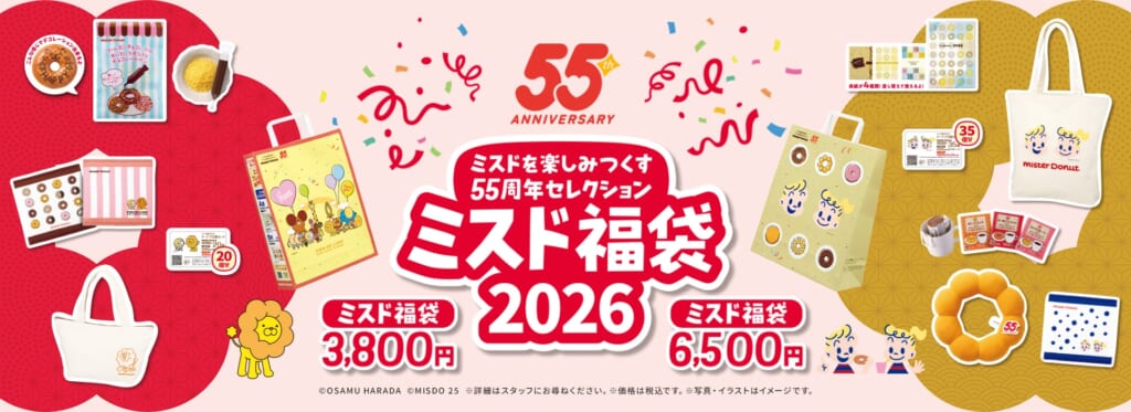 2025年12月27日に、ミスタードーナツの創業55周年を記念した「ミスド福袋2026」が発売されました。