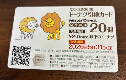 福袋の最大の価値は、税込209円以下のドーナツ20個と引き換え可能な「ドーナツ引換カードです。
