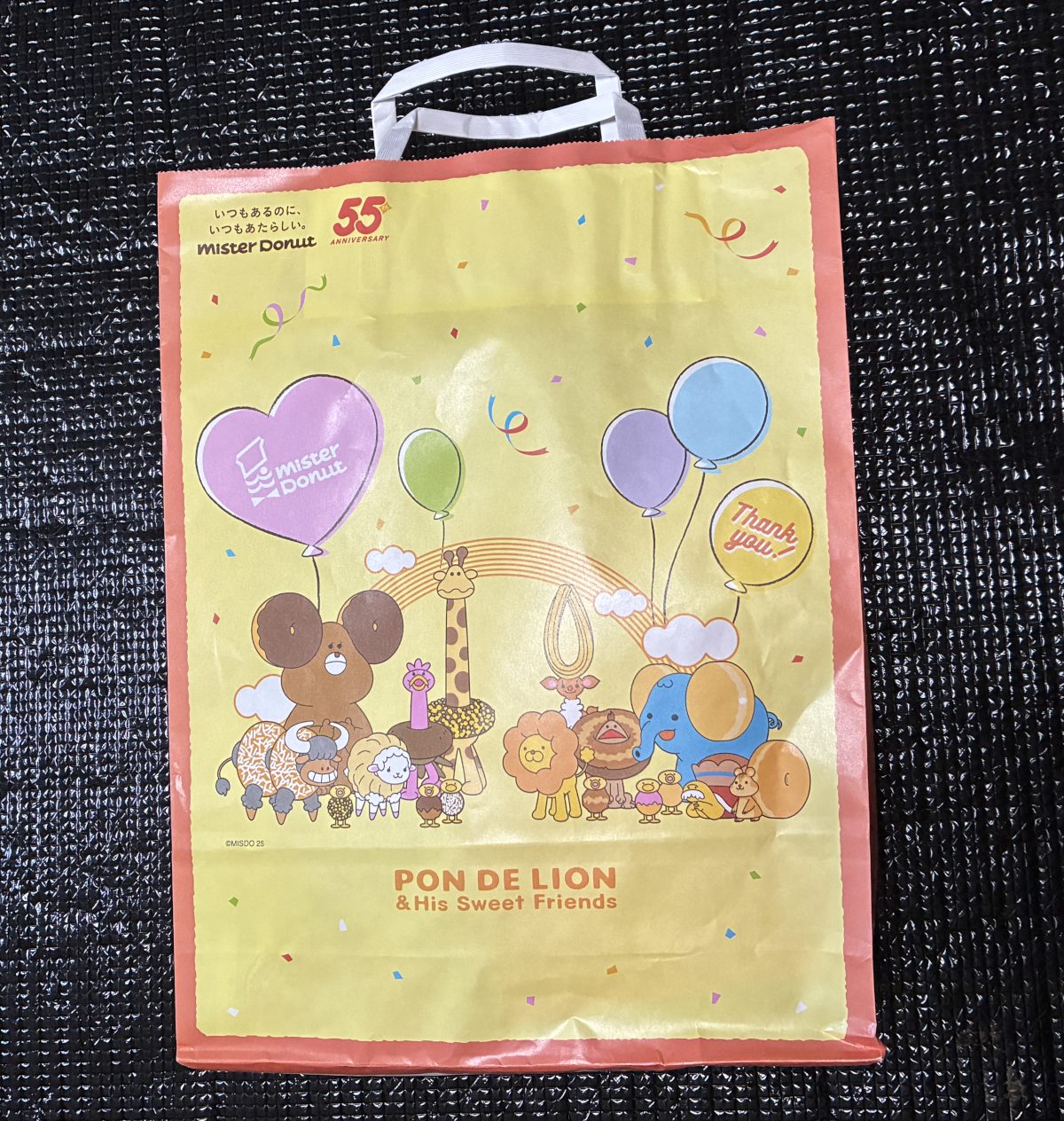 福袋の外袋は、ポン・デ・ライオンと仲間たち、バルーンなどが描かれた55周年らしい賑やかなデザインです。持ち帰る際にも「福袋らしさ」を感じさせ、SNS用の写真撮影にも適しています。