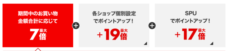 1/1のワンダフルデーと1/1〜1/3の新春ポイントアップ祭りでのポイントアップに、各ショップ個別のポイントアップ最大+19倍、SPU(スーパーポイントアッププログラム)の最大+18倍も組み合わせることで、合計で最大43倍までポイントアップさせることが可能です。
