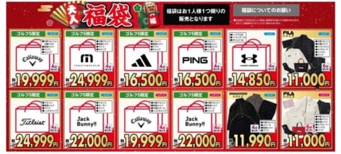 キャロウェイ、ジャックバニー、アディダス、ピンなど、有名ブランドのアパレルを詰め込んだ福袋を12種類販売します。ゴルフ5限定福袋も登場し、見逃せない内容です。