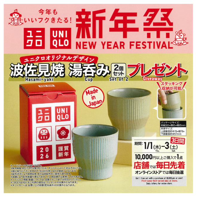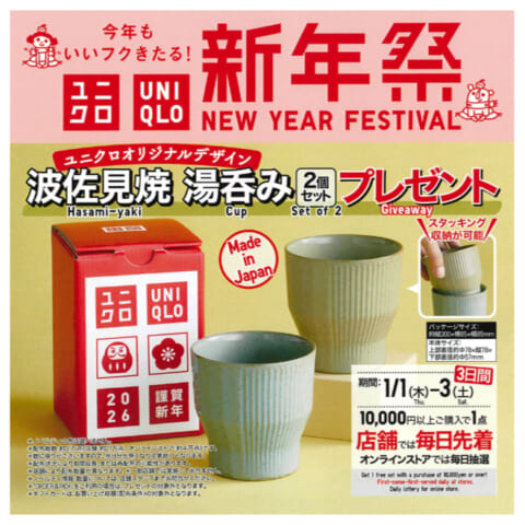 2026年1月1日(木)から1月3日(土)の3日間限定で、税込1万円以上の購入で「波佐見焼 湯呑み(2色セット)」を進呈します。