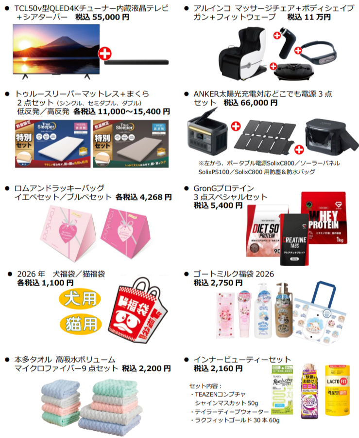 今回の初売りでは、多種多様なジャンルの福袋が展開されます。公式資料に掲載されている福袋の具体例を一部ご紹介します。