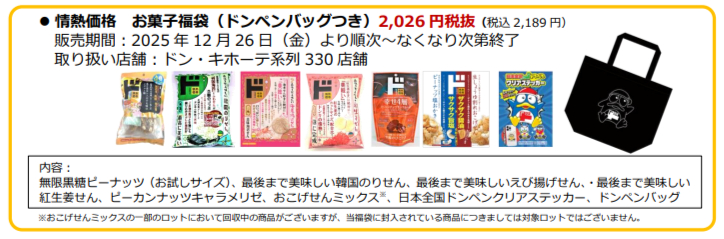 2026年1月1日の初売りを待たずに、年内から購入できる福袋も登場します。情熱価格「お菓子福袋(ドンペンバッグつき)」が先行販売されます。